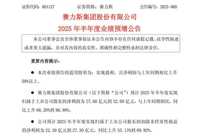 7月11日,赛力斯悄悄挂出半年度业绩预增公告:归母净利润27亿-32亿元,同比增长约66%-97%;扣非净利润22.3亿-27.3亿元,同比增长约55%-90%。这堪称赛力斯史上最强中报预告。