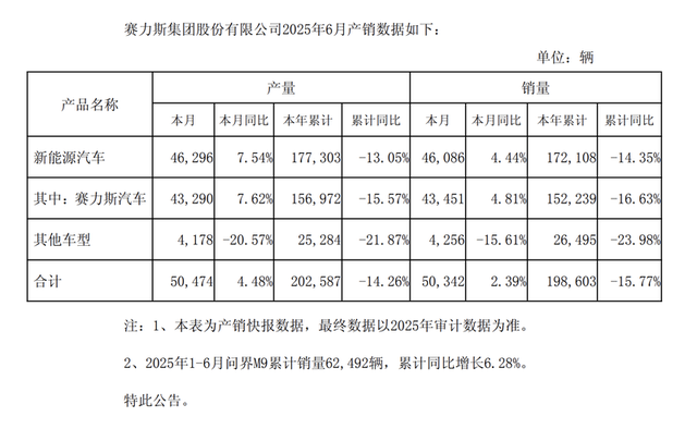 然而,回顾赛力斯发布的6月产销快报,2025年1-6月其累计销量198,603辆,同比下滑幅度达到15.77%。其中,1-6月赛力斯新能源汽车累计销量达172108辆,同比下降14.35%。