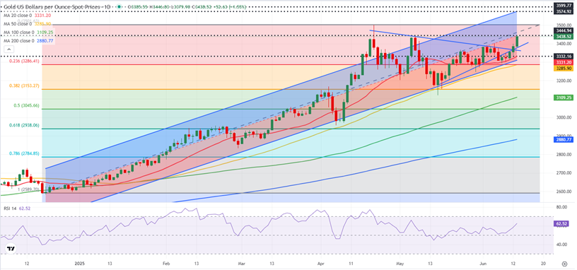 Sengezer写道,上周,在美元普遍疲软和地缘政治紧张局势升级的支撑下,金价攀升至3400美元/盎司上方。近期技术前景显示看涨势头正在增强。